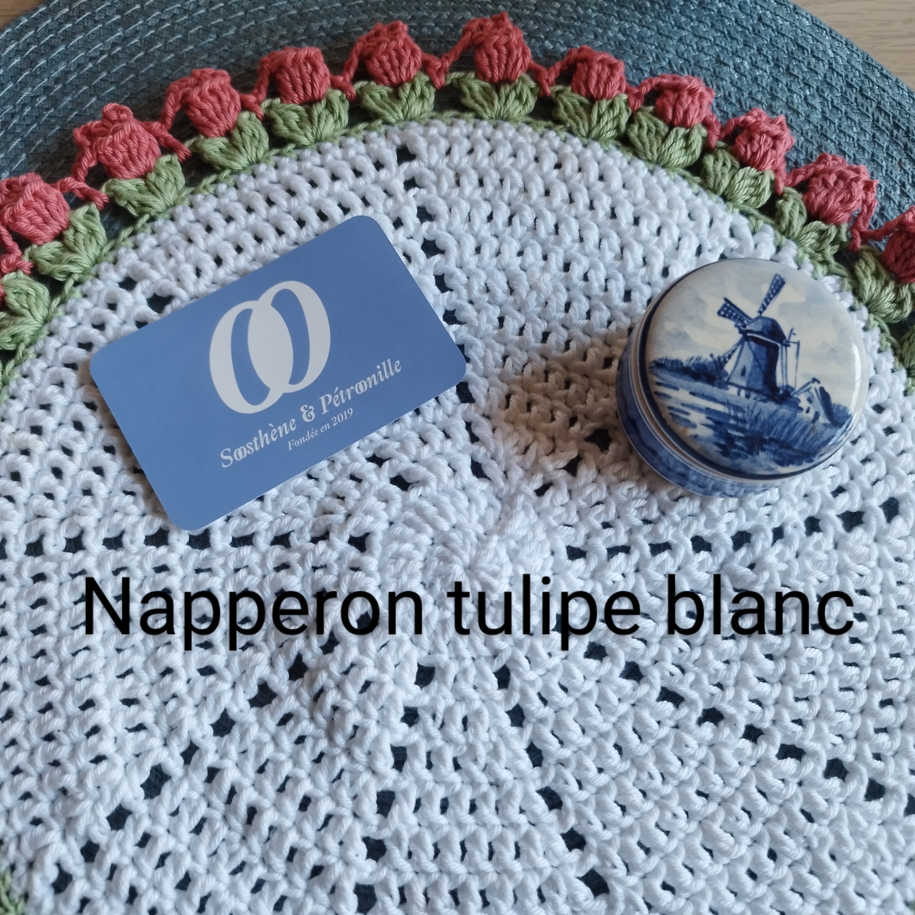 Napperon tulipe corail et fond blanc, qui fait main entièrement.