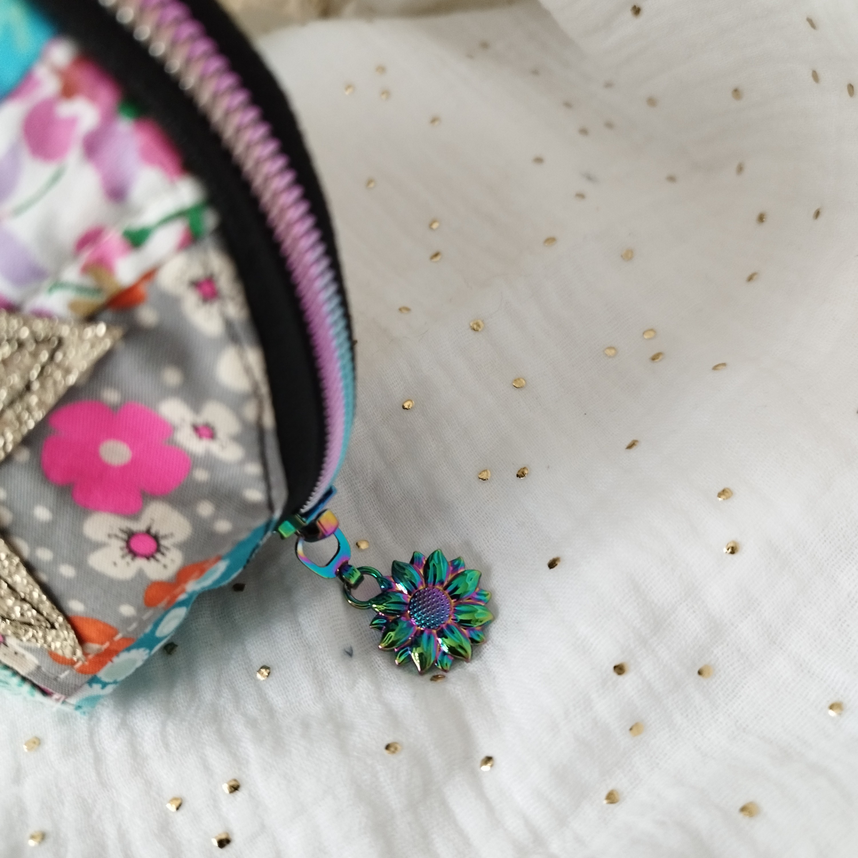 Très colorée avec les chutes de tissus du moment ,un petit Zip tournesol.