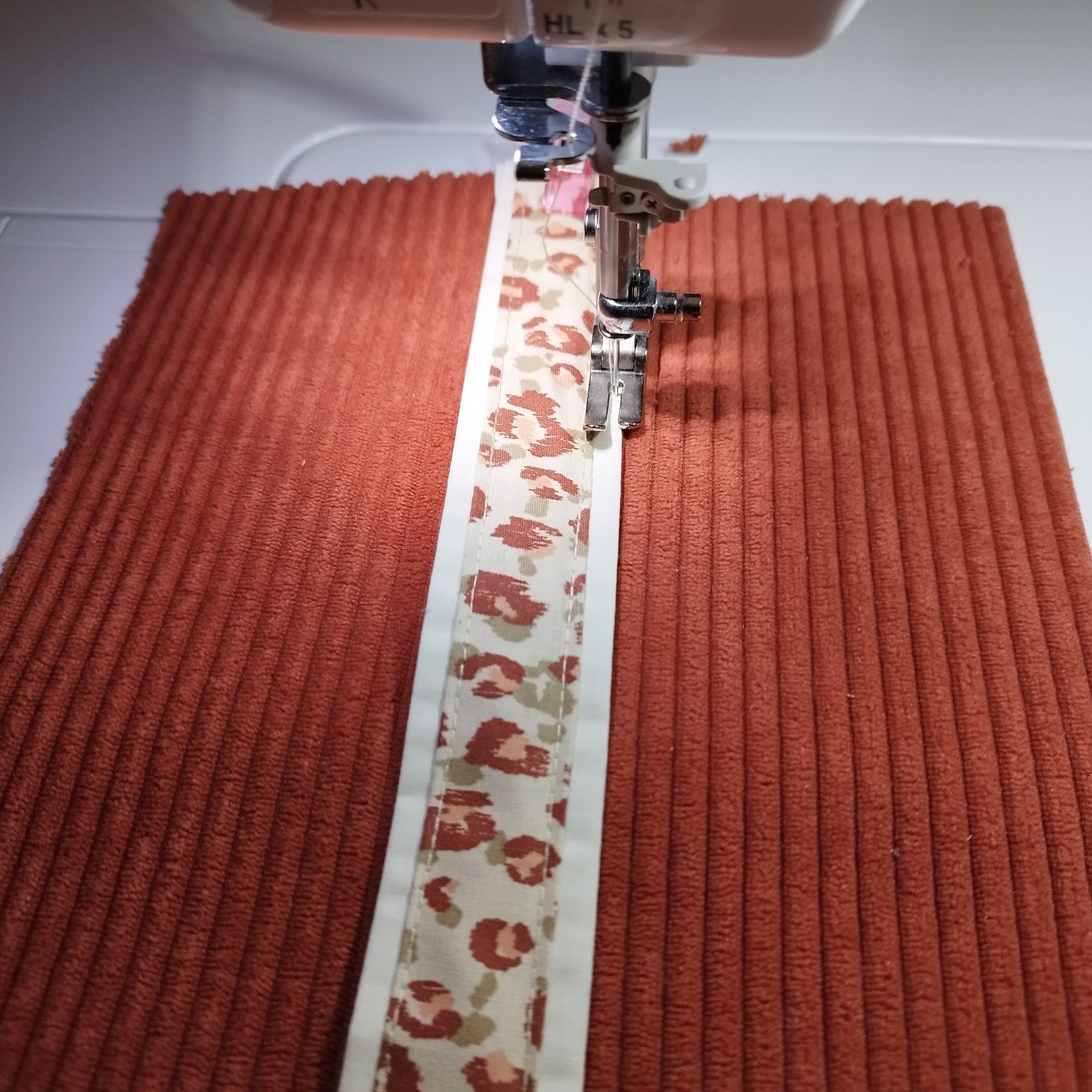 Une photo avec la création de la bande signature, elle rappelle le tissus de la doublure.